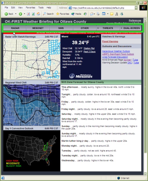 | The OK-FIRST Weather Briefing works just like the original "Current Data" gateway: you can access the heart of the OK-FIRST site. Select "Radar", "Mesonet", "NWS", "Other", Choose Your Threat, or use the split-screen option, just like before. | ||