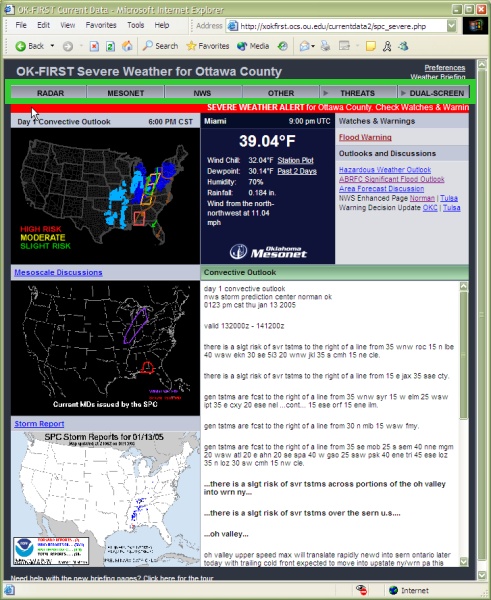 | The product on the Severe Weather Enhanced Briefing are more focused on Day 1 hazardous weather threats. The products are slightly different, but the Severe Weather Enhanced Briefing provides the same access to the complete OK-FIRST contents as the Weather Briefing page and the original "Current Data" gateway. | ||